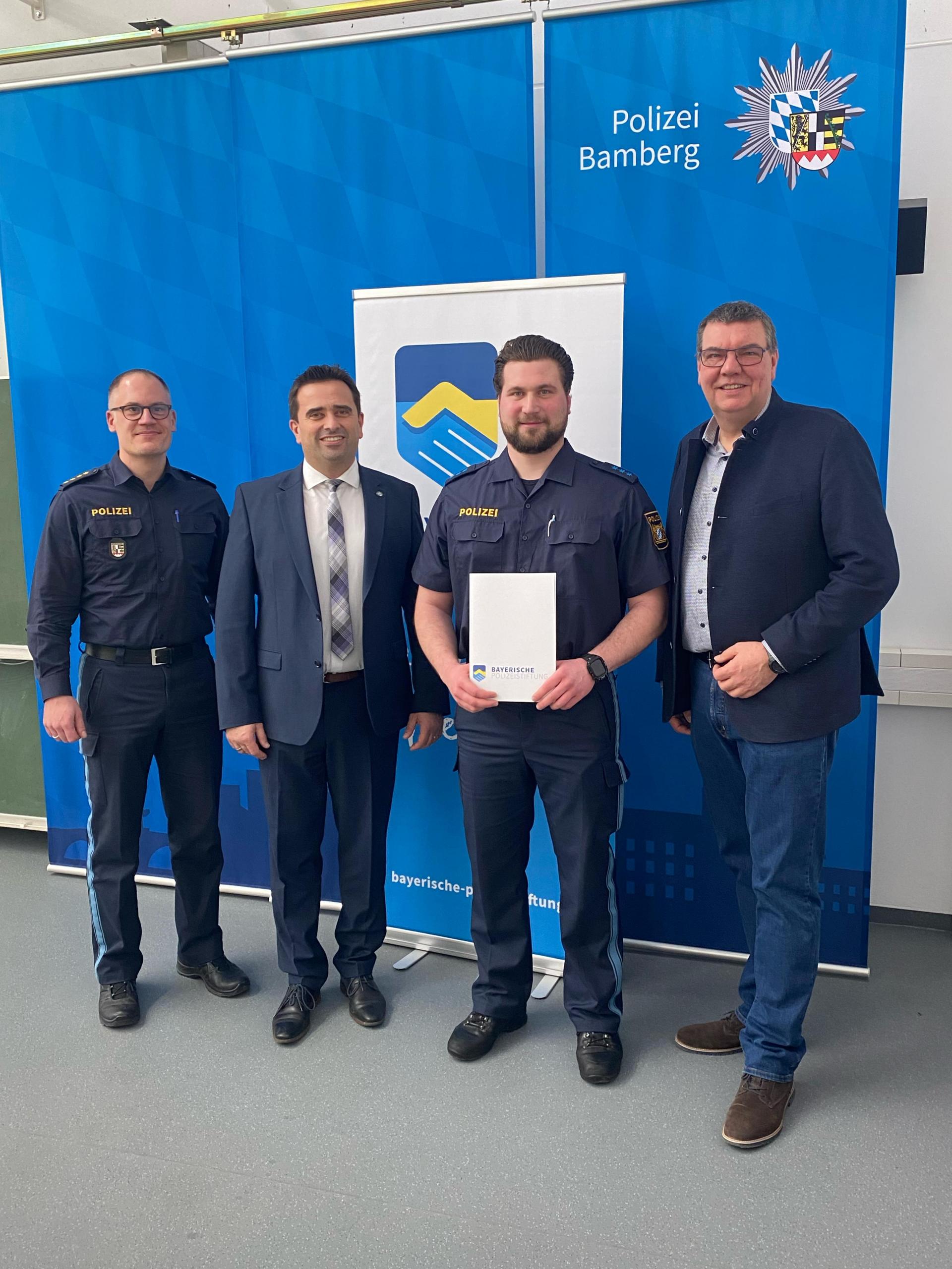 Nachdem POM Nino Schneiderbanger zwischenzeitlich in das PP Oberfranken versetzt wurde, erfolgte die Übergabe der Zuwendung vor kurzem durch den Stiftungsvorsitzenden Thomas Lintl im Beisein von PP Markus Trebes. Ebenfalls anwesend waren LPD Florian Mayer (PI Bamberg-Stadt), der Personalratsvorsitzende Jürgen Köhnlein (gleichzeitig Vorstandsmitglied der Bayerischen Polizeistiftung) und der antragstellende Personalrat Norbert Schuberth.