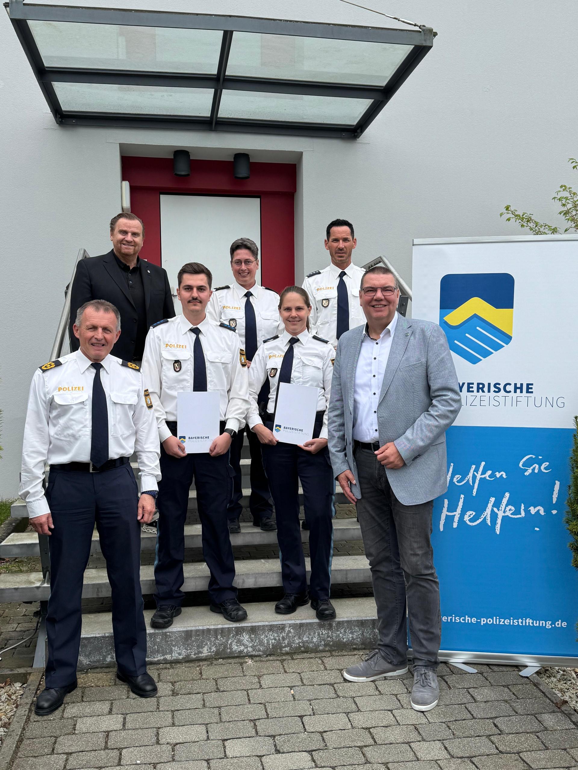 Im Beisein des PP Armin Schmelzer, PDin Christine Götschel und PHK Christian Hoppert sowie dem Personalratsvorsitzender Jürgen Köhnlein (gleichzeitig Vorstandsmitglied der Bayerischen Polizeistiftung) und Peter Stenglein übergab der Stiftungsvorsitzende Thomas Lintl unlängst Zuwendungen an die beiden Einsatzkräfte.