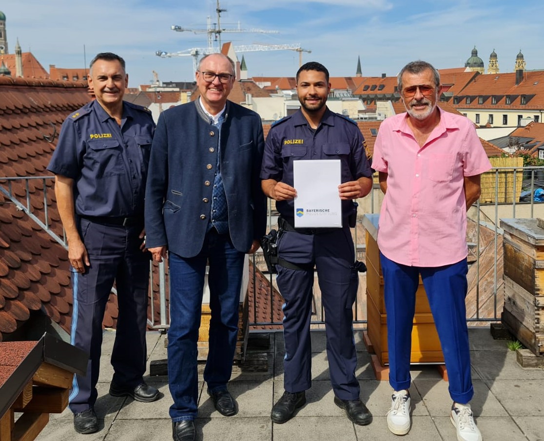 Im Beisein des stellvertretenden PI-Leiters der PI 11, POR Jochen Geißer, sowie des antragstellenden Personalrates Alfred Kammermeier übergab der stellvertretende Vorsitzende der Bayerischen Polizeistiftung Jürgen Ascherl vor kurzem einen Scheck an den verletzten Kollegen.